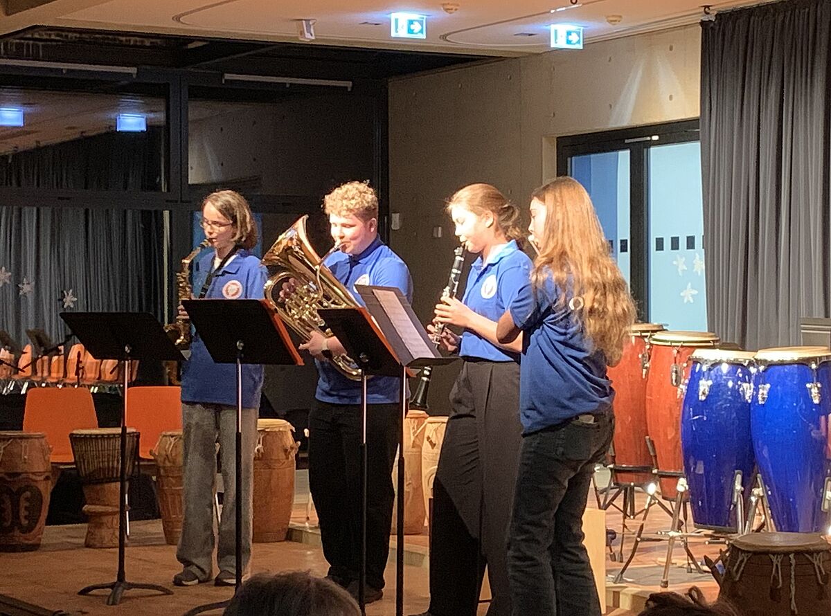 Es folgten mitreißende Rhythmen der Perkussionensembles unter der Leitung von Birgit Koch und bereits beeindruckend klangvoll musizierenden Bläserklassen der Jahrgänge 5 und 6.
