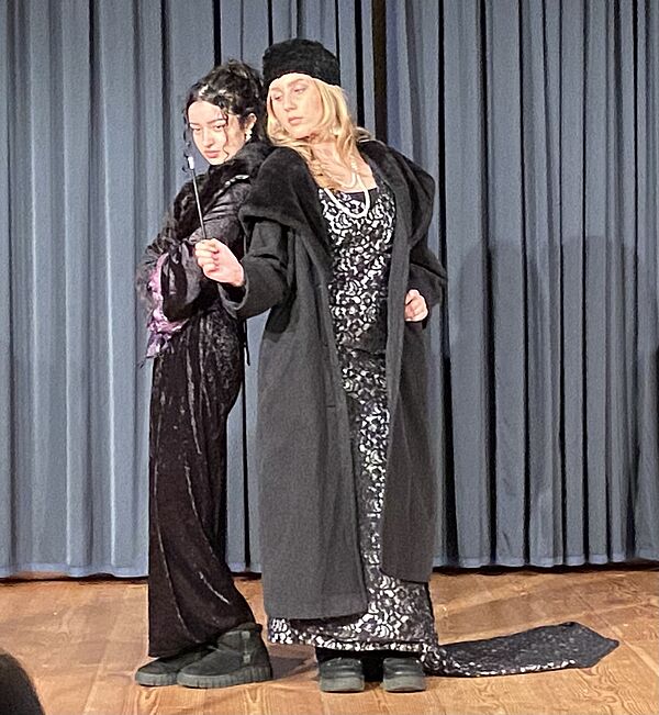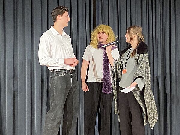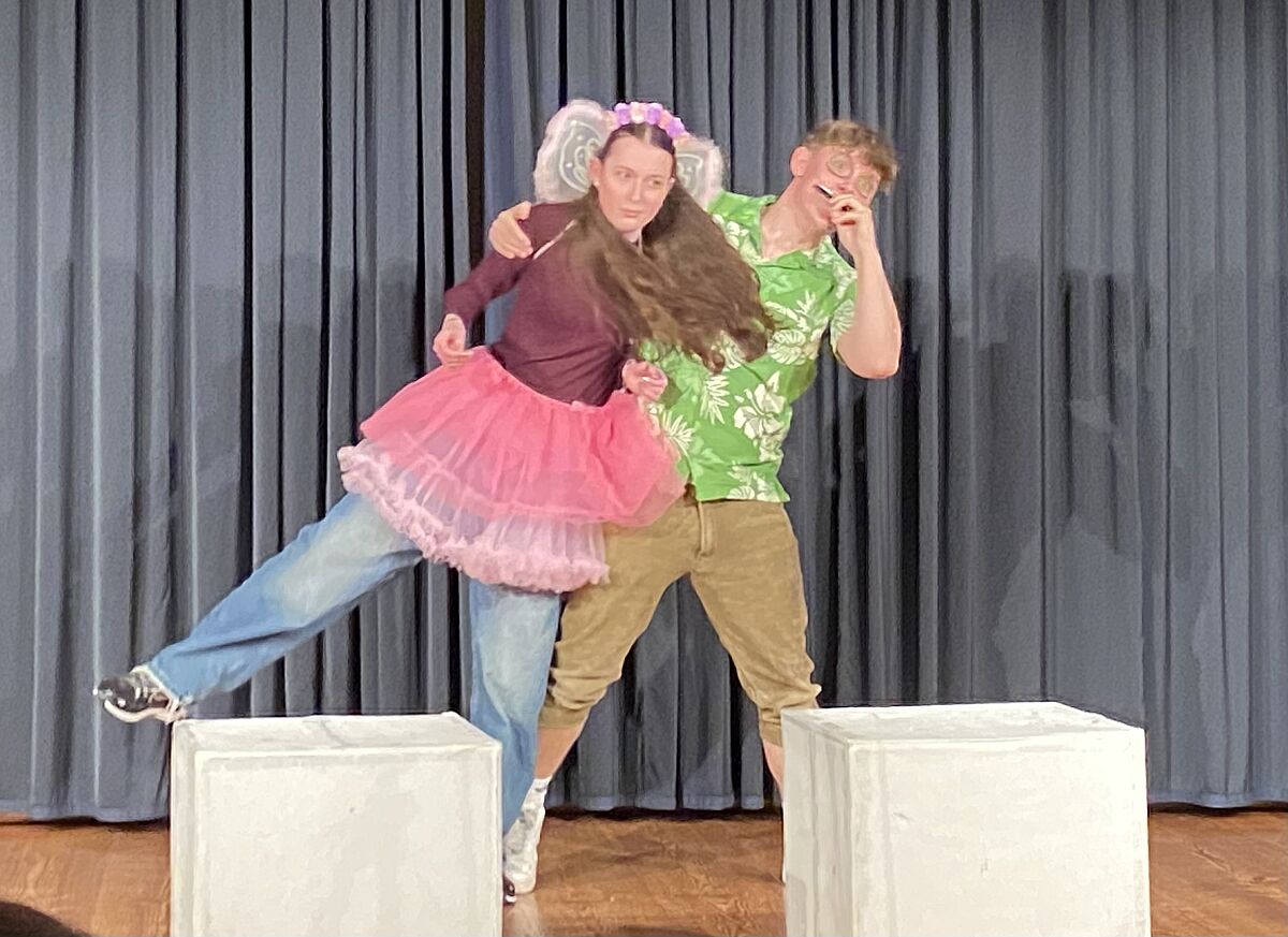 Nach der Pause hatte Jahrgang 13 unter der Leitung von Sophie Frommhage-Davar seinen großen Auftritt. In einem „Fiebernachtstraum“ - angelehnt an Shakespeares „Sommernachtstraum“ – verschmolzen sie Realität und Traum (und wahrscheinlich auch ein kleines Bisschen Wahnsinn). Lysander, Helena, Hermia und Demetrius sowie Titania und Oberon bewältigten ihre Beziehungskrisen mit ähnlich viel Körpereinsatz wie im Original, hatten aber zusätzlich moderne, ebenfalls von Eifersucht und Schuldzuweisungen geplagte Pendants. Mittendrin trieb Waldgeist Puck seinen Unfug und wirbelte alle (inklusive sich selbst) emotional gehörig durcheinander.
