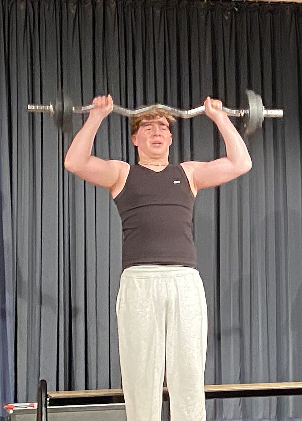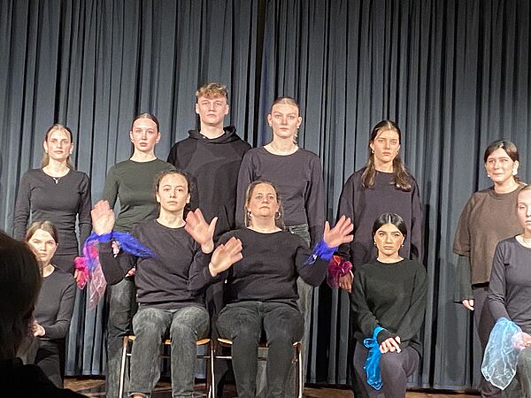 Tänzerisch-rhythmisch wurde es bei der Performance der von Katharina Kühn geleiteten Gruppe aus Jahrgang 11, die ein pantomimisches „Chairduet“ zeigte, geprägt von wechselnden Besetzungen und wiederkehrenden Bewegungsfolgen, die zu einem ästhetischen Ganzen verwoben waren.