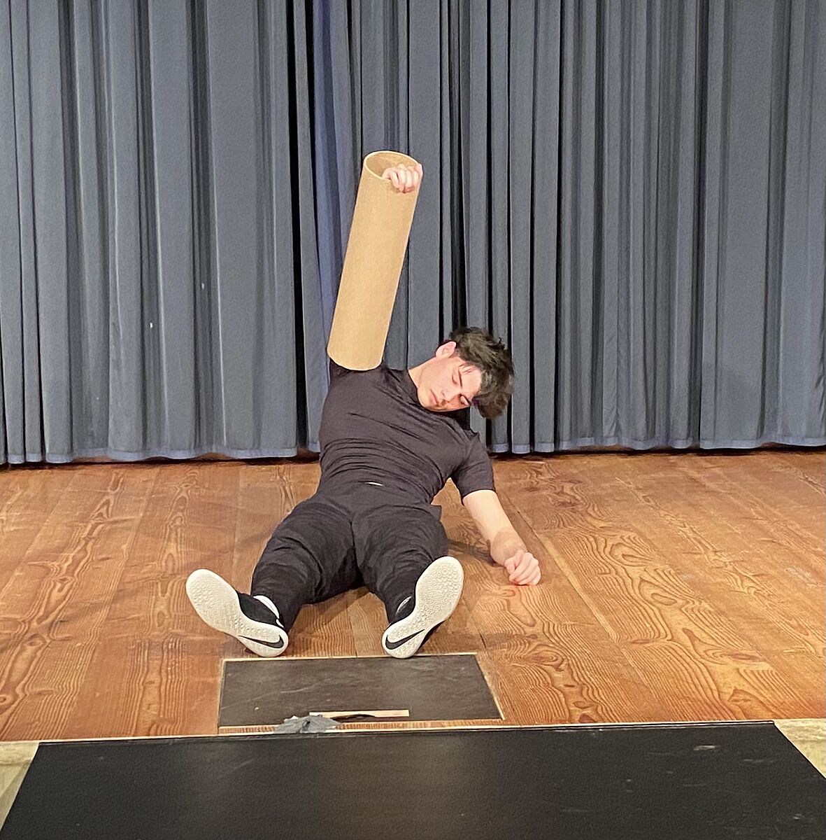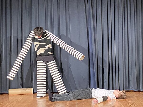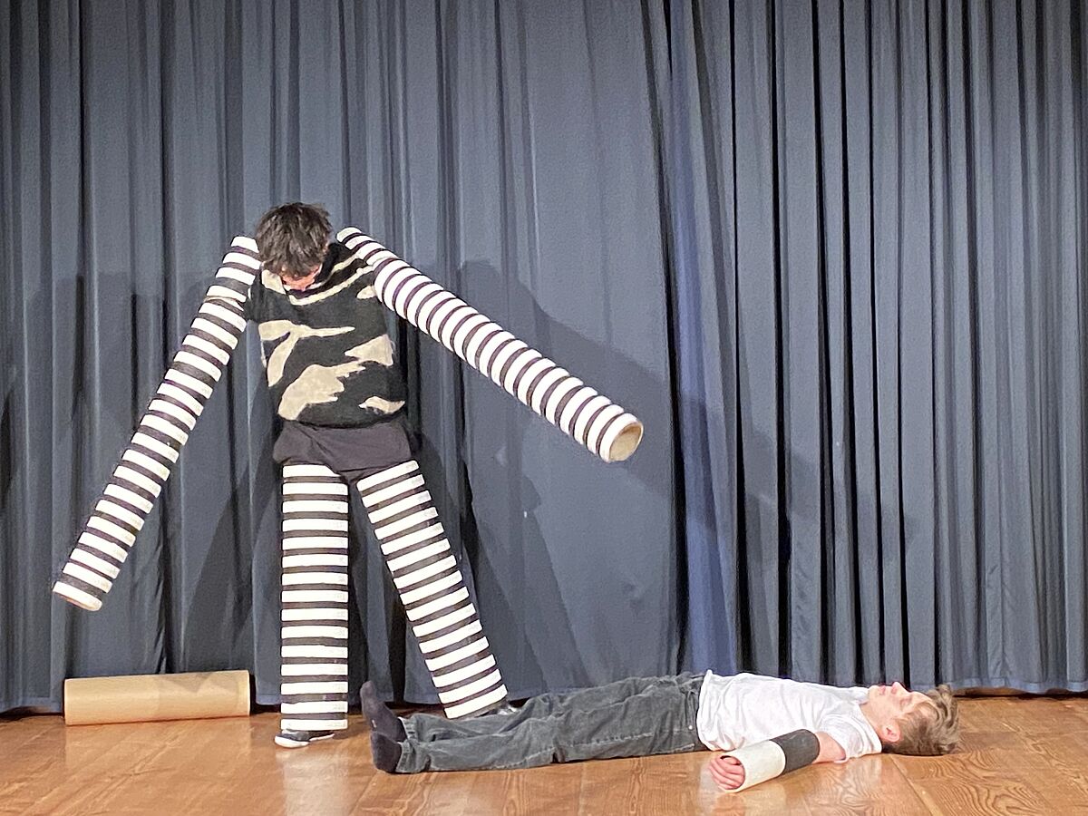 Zum „Rollenwechsel“ kam es für die Schülerinnen und Schüler des Jahrgangs 12 aus der Gruppe von Sophie Frommhage-Davar, denn diese trugen mit ihren Kostümen zugleich ein Bewegungshandicap. Große Papprollen waren über Arme und Beine gestülpt und forderten die Darstellenden zu einer berührenden Choreografie zwischen Tanz, Scheitern und Störung heraus.