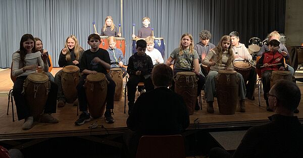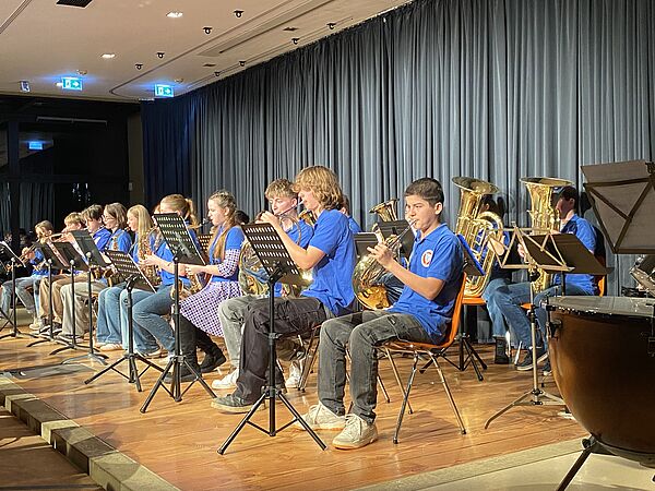 Es folgten mitreißende Rhythmen der Perkussionensembles unter der Leitung von Birgit Koch und bereits beeindruckend klangvoll musizierenden Bläserklassen der Jahrgänge 5 und 6.