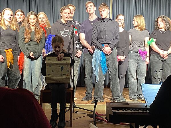 Nach der Pause zog der Schulchor unter der Leitung von Katharina Kühn das zahlreich erschienene Publikum mit fein gesungenen Chorarrangements und einfallsreichen Choreografien in seinen Bann.