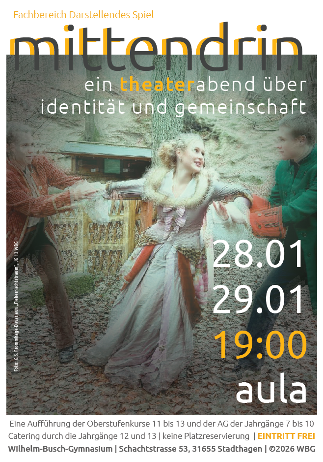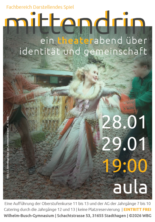 In „Mittendrin“ erzählen die Schülerinnen und Schüler des Wilhelm-Busch-Gymnasiums Geschichten, die sich mit ihren Erwartungen, den eigenen Träumen und persönlichen Erfahrungen im Schulleben und ihrem häuslichen Alltag beschäftigen. Collage-Szenen über Freundschaft, Socialmedia, Mobbing, Leistungsdruck und die Suche nach dem eigenen Platz in der Gemeinschaft stehen im Fokus. Dabei verhandeln sie tanzend, singend und theatral Fragen wie: Wer bin ich wirklich? Was macht mich eigentlich besonders – oder ganz gewöhnlich? Improvisationselemente, Postdramatik, Requisitenspiel und dokumentarisches Theater bieten eine authentische, energiegeladene und mitreißende Darstellungsform, die direkt aus dem Lernprozess entsprungen ist.