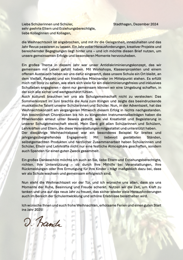 Der Weihnachtsbrief des Schulleiters für Eltern, Erziehungsberechtigte, Schülerinnen und Schüler.