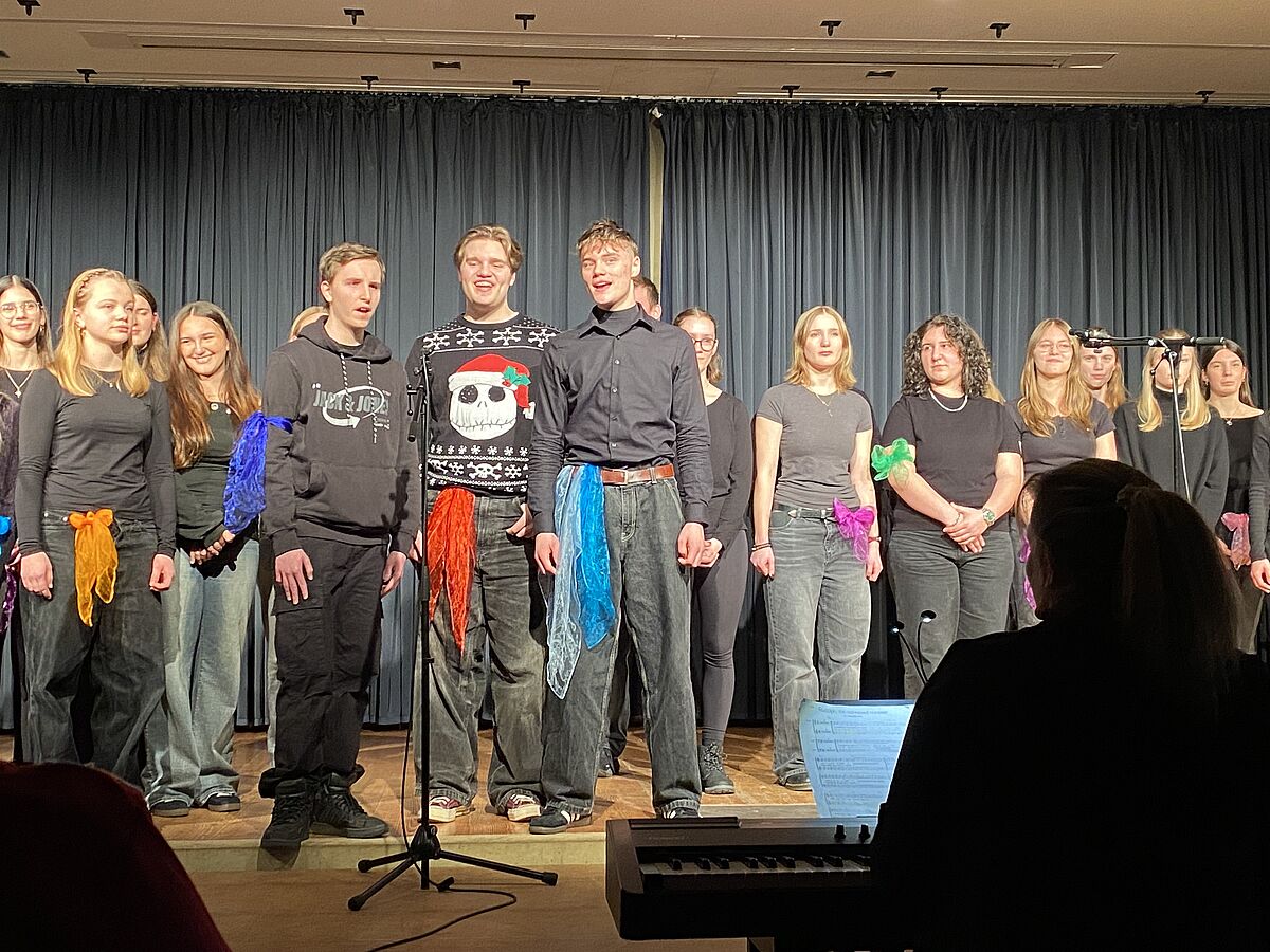 Nach der Pause zog der Schulchor unter der Leitung von Katharina Kühn das zahlreich erschienene Publikum mit fein gesungenen Chorarrangements und einfallsreichen Choreografien in seinen Bann.