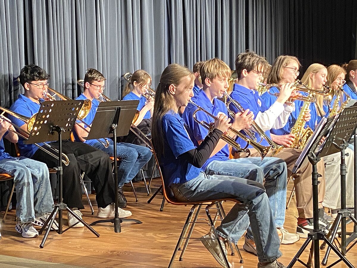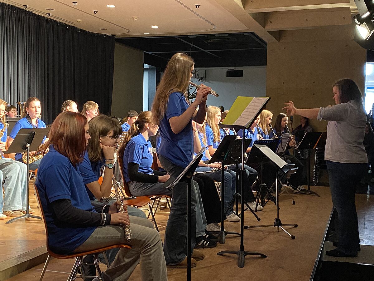 Das in diesem Jahr neugegründete Mittelstufenorchester mit SchülerInnen der Jahrgänge 6 und 7 meisterte seine Konzertpremiere unter anderem mit der Originalkomposition für Blasorchester „Viking“ von Michael Sweeney.