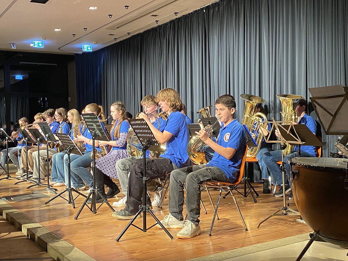 Es folgten mitreißende Rhythmen der Perkussionensembles unter der Leitung von Birgit Koch und bereits beeindruckend klangvoll musizierenden Bläserklassen der Jahrgänge 5 und 6.